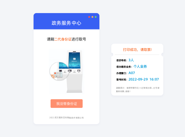 办事群众通过刷身份证或者输入身份证号的方式进行身份验证,验证通过后再输入手机号码,选择办事部门和事项后生成打印小票。
