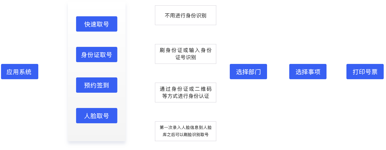 办事人员通过首次身份证进行人脸注册,将人脸信息录入到人脸库中,之后可以通过人脸识别进行快速刷脸比对取号。