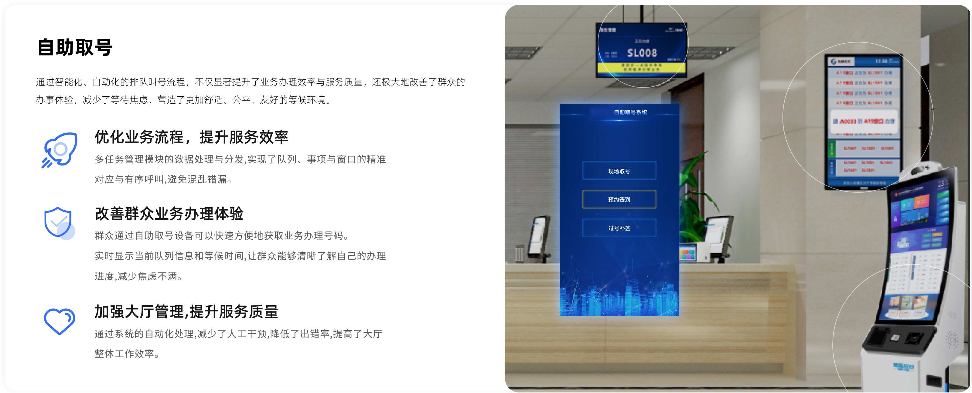 系统除基础的排队叫号功能外,还与业务系统深度结合,从办事人员信息采集、在线预约、二维码集成、事项联办、实时排号、线上引流、数据沉淀等方面为办事群众提供更便捷的办事服务,提升政务服务中心的形象。