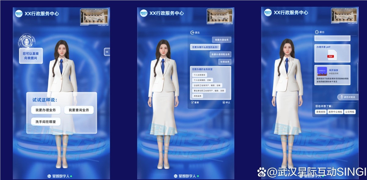 星际互动以AI数字人技术为核心,推出了一系列智能化、高效化的数字人产品,覆盖政务服务的多个场景,助力政务服务从传统模式向数智化方向转型升级。以下是星际互动数字人系列产品及其在政务领域的典型应用场景: