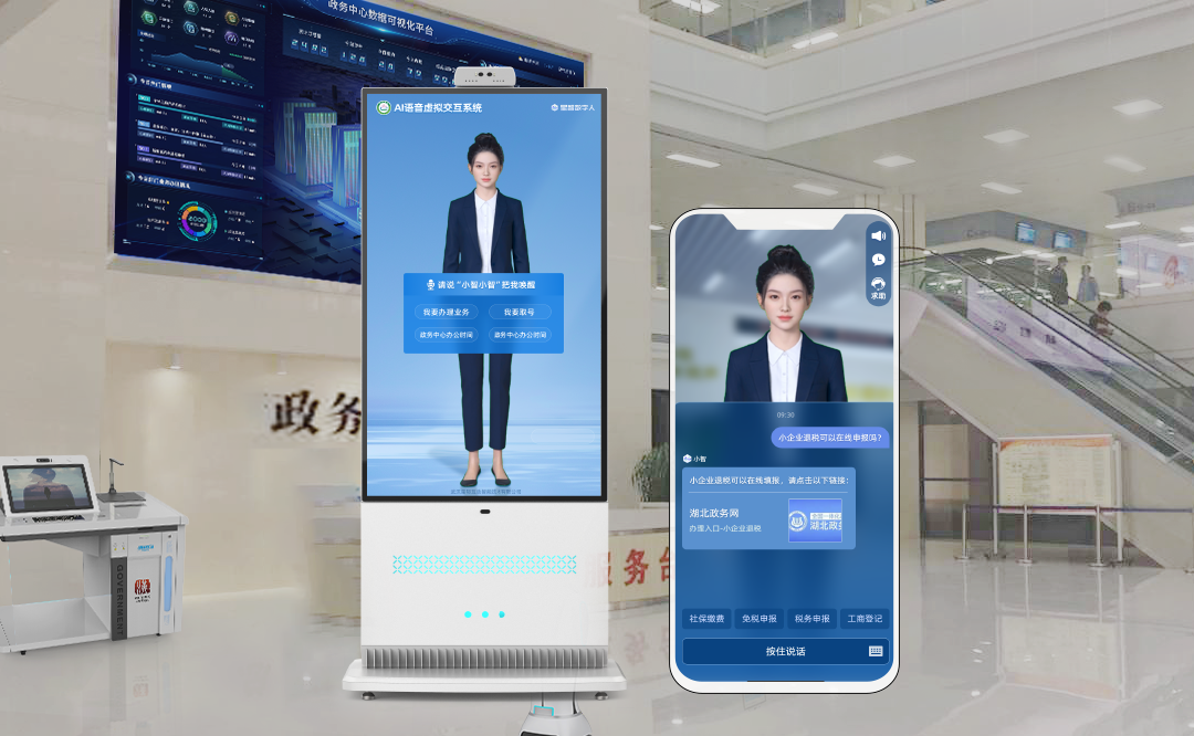引入集成语音与文本交互的AI数字人客服,可灵活部署于移动端和一体机终端,提供7x24小时不间断的实时咨询、业务导办服务。