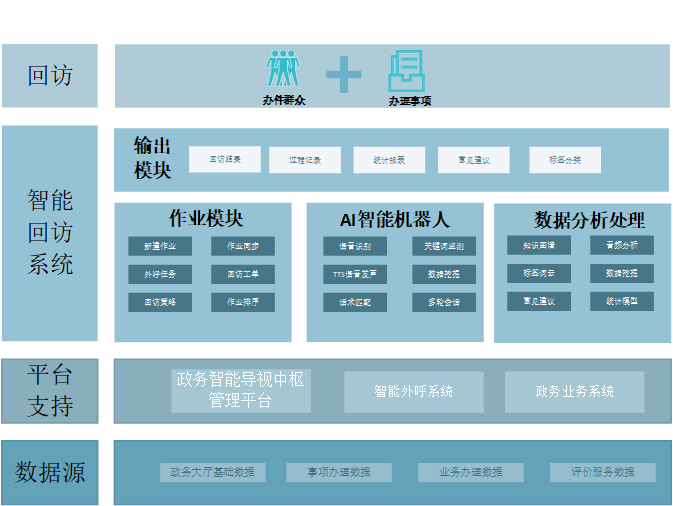 SINGI-智能回访系统,产品主要提供事项办理完毕后的智能自动回访服务,在原有人工电话回访评价渠道基础上,通过人工智能外呼机器人,自动获取需回访的诉求工单信息,实现科学有序的批量回访。系统依托于语音识别(ARS)、知识图谱、关键词监测、数据挖掘分析等前沿技术,实现AI多轮对话、自动汇总与数据分析,同时支持不同受理业务/办件群众属性设置不同回访策略与话术,有效解决电话政务中心回访工作量大、重复性高、人员培训难等问题。
